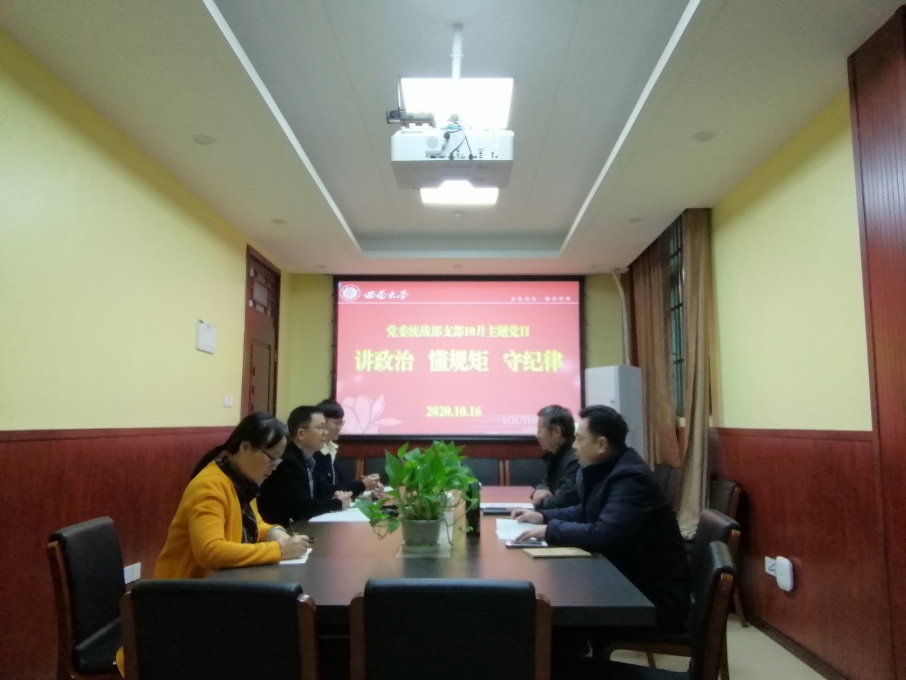 1016日上午,统战部支部在会议室举行讲政治 懂规矩 守纪律主题党日活动。支部全体党员参会。
