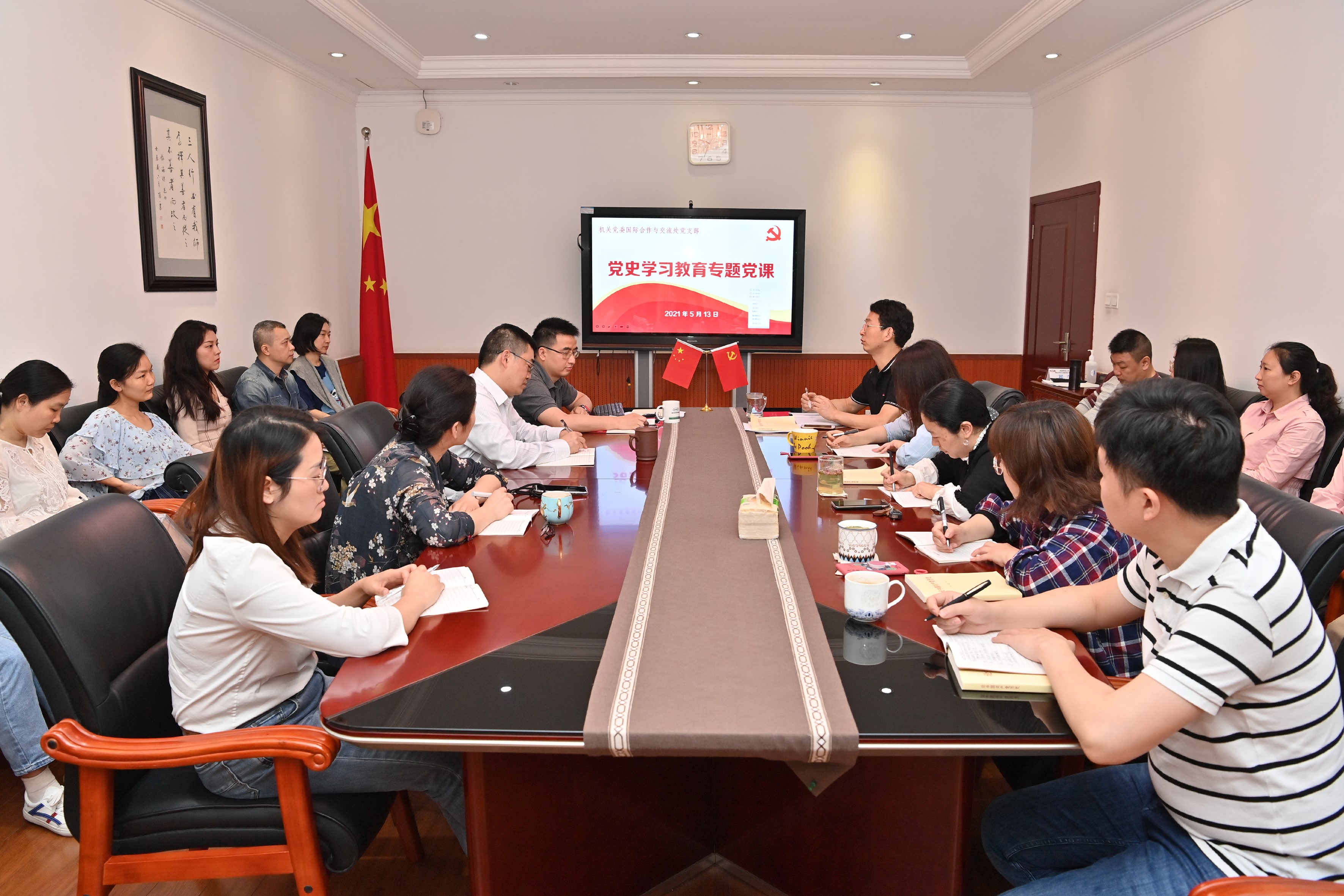 2021年5月13日上午,国际合作与交流处党支部在二楼会议室开展以“深学党史增强信念、细悟《条例》夯实基础”为主题的党日活动。支部副书记陈炳君同志和预备党员周炼同志向全体职工讲授了党史学习教育专题党课。
