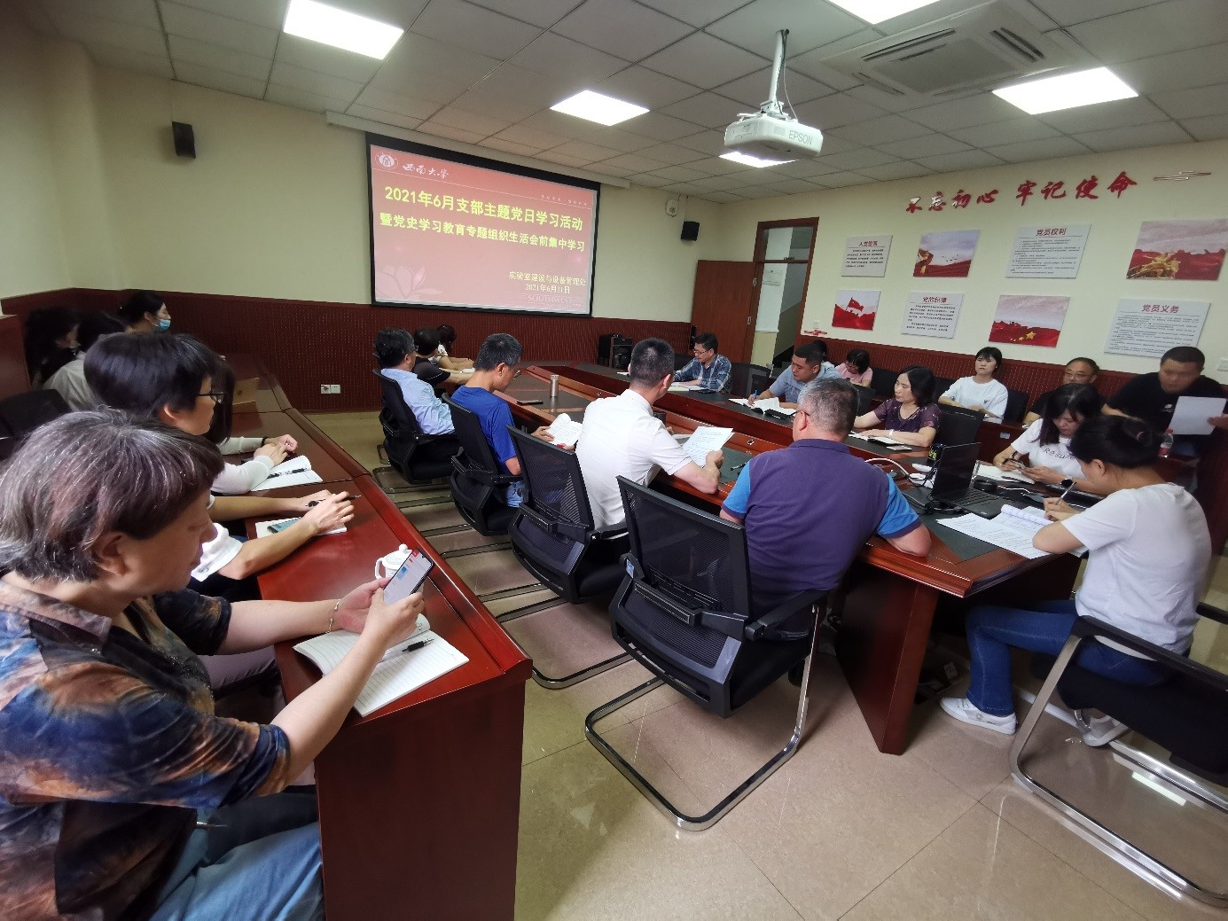 6月11日上午,全体党员集中开展了党史学习教育。学习会上,王全玉副处长导学了《中国共产党简史》第十章,秦福生教授根据习近平总书记《用好红色资源,传承好红色基因,把红色江山世世代代传下去》学习心得体会和自身经历为全体党员讲授了题为《学习和传承红色故事的时代意义》的专题党课。随后,党小组长李朝明、张国娜和党员周志云分别领学了《中国共产党组织工作条例》《中国重庆市委教育工委关于在全市教育系统深入开展向王红旭老师学习的通知》《论中国共产党历史》等内容,并分享了心得体会。此外,全体党员还观看了《用爱浇灌教育之花—叶建勋师德师风先进事迹》《全国大学生党史知识竞答大会》等内容视频。