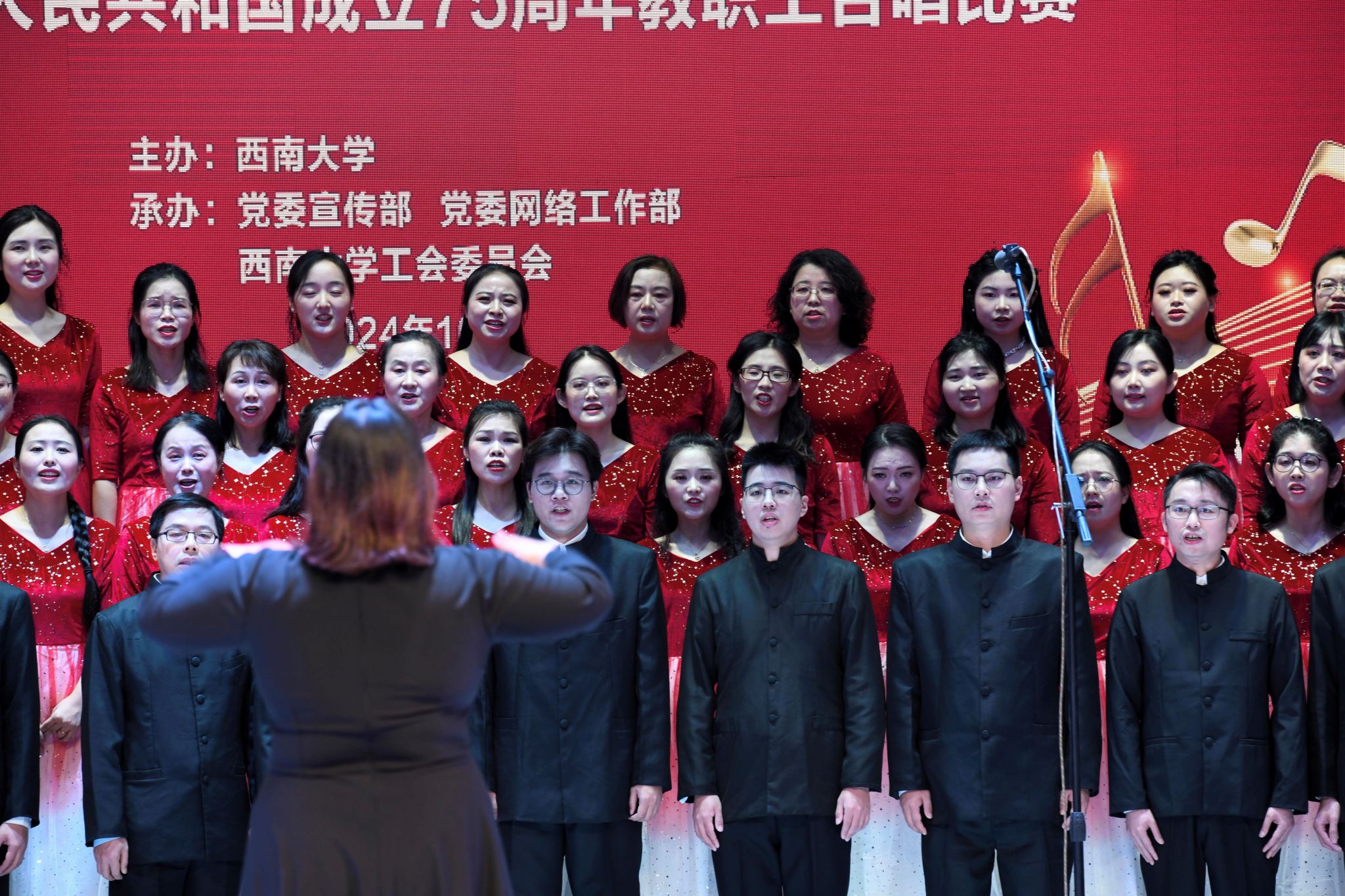 为庆祝中华人民共和国成立75周年,进一步激发全校师生爱党、爱国、爱社会主义的真挚情感,1026日,PA视讯官网庆祝中华人民共和国成立七十五周年教职工合唱比赛在大礼堂隆重举行,经过激烈角逐,机关教职工合唱团演唱歌曲《领航》《我们走在大路上》获得一等奖。