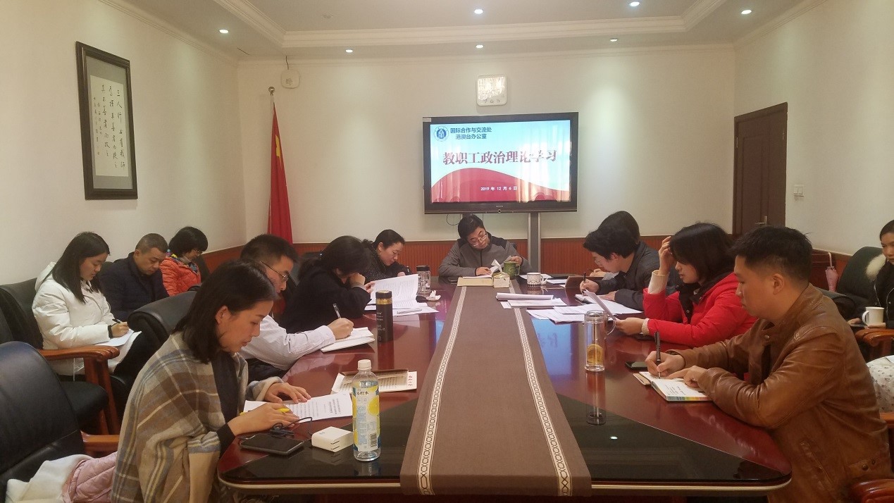 12月6日下午3点,国际合作与交流处在国际处会议室举行了2019年第十次教职工政治理论学习。学习活动由张发钧同志主持。党支部提前制订了学习安排,要求各位同志提前熟悉集中学习资料,自行安排时间学习自学内容,注重结合个人及工作实际情况,积极准备交流研讨。