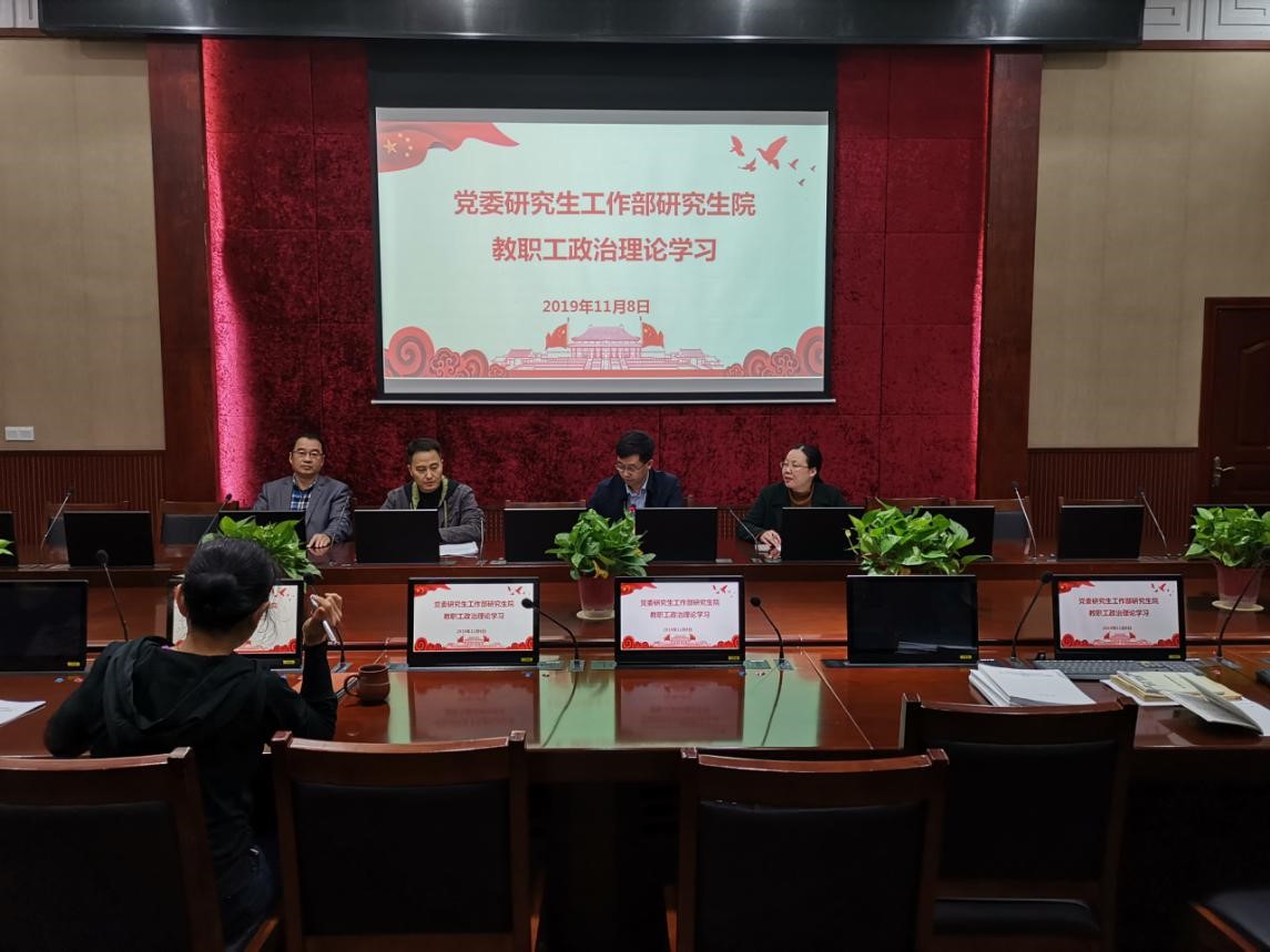 根据学校要求,党委研究生工作部研究生院于2019年11月8日下午,在八一礼堂电子会议室召开了2019年第九次教职工政治理论学习。会议由胡娟同志主持。