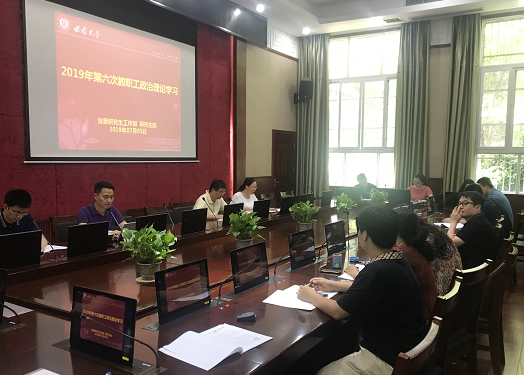 根据学校要求,党委研究生工作部研究生院于2019年7月5日下午,在八一礼堂电子会议室召开了2019年第六次教职工政治理论学习。会议由党委研究生工作部副部长胡娟同志主持。
