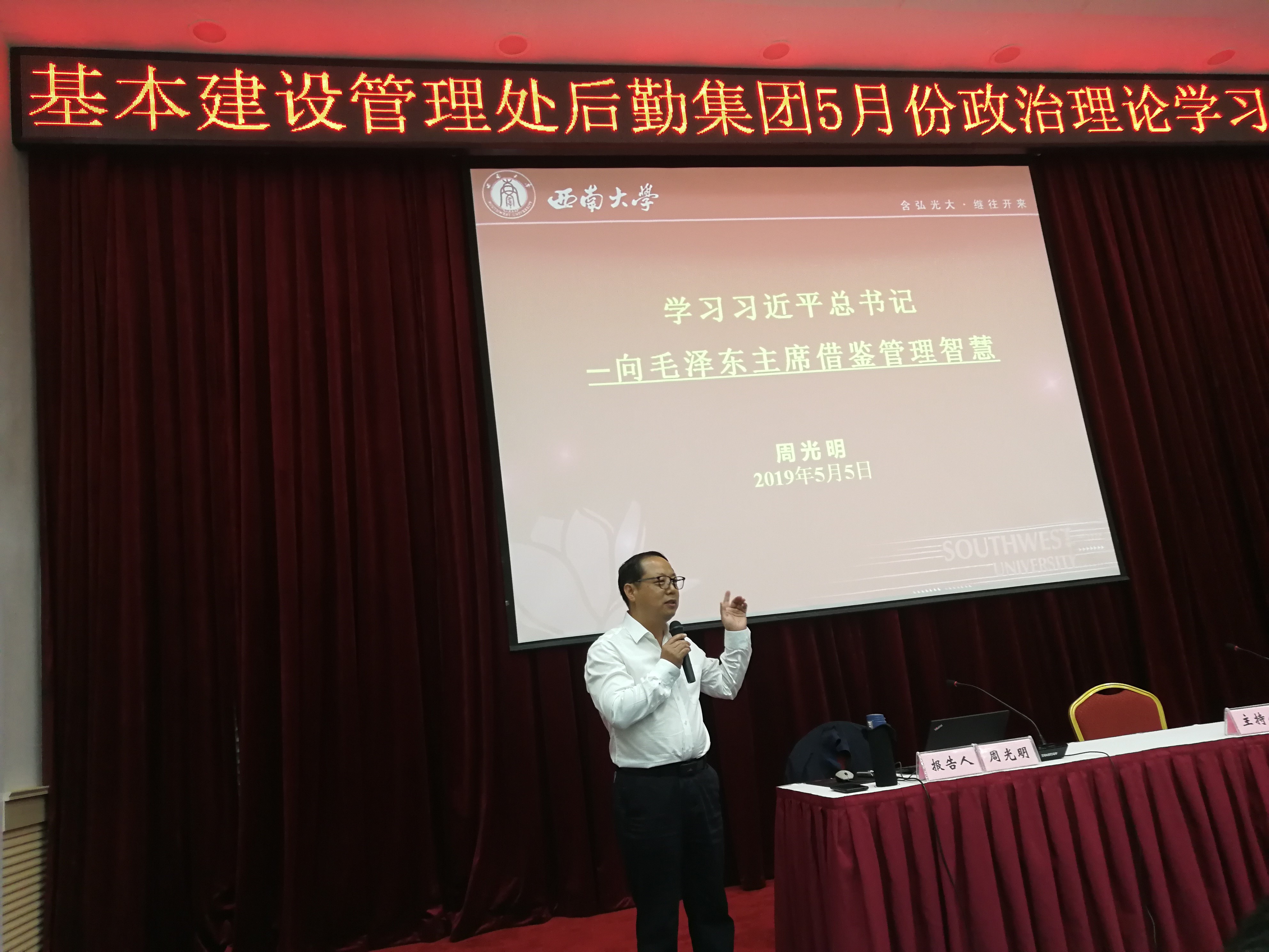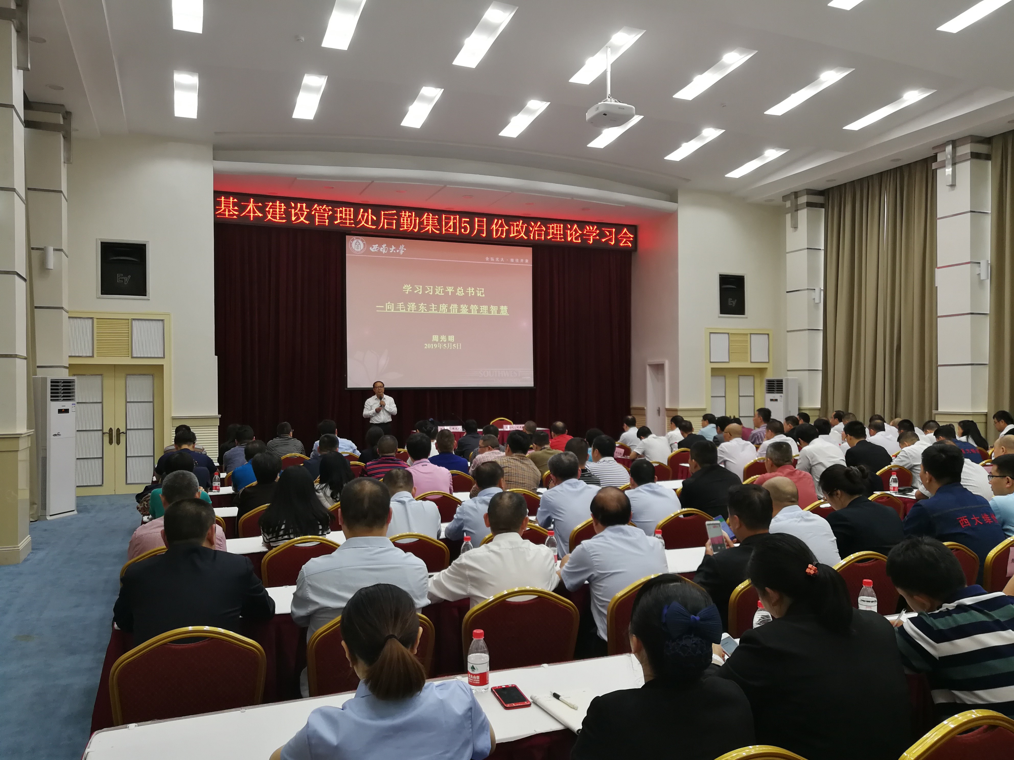 2019年5月5日下午,是学校统一安排的5月政治理论学习时间,校长助理周光明教授作了题为《学习习近平总书记—向毛泽东主席借鉴管理智慧》的专题讲座,本次讲座由后勤集团书记刘健长主持。基本建设管理处全体职工和后勤集团部分干部职工参加了本次学习。