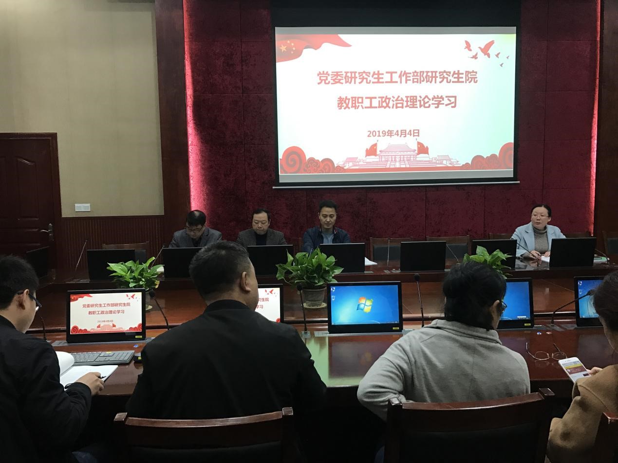 根据学校要求,党委研究生工作部研究生院于2019年4月4日上午,在八一礼堂电子会议室召开了2019年第三次教职工政治理论学习。会议由胡娟同志主持。