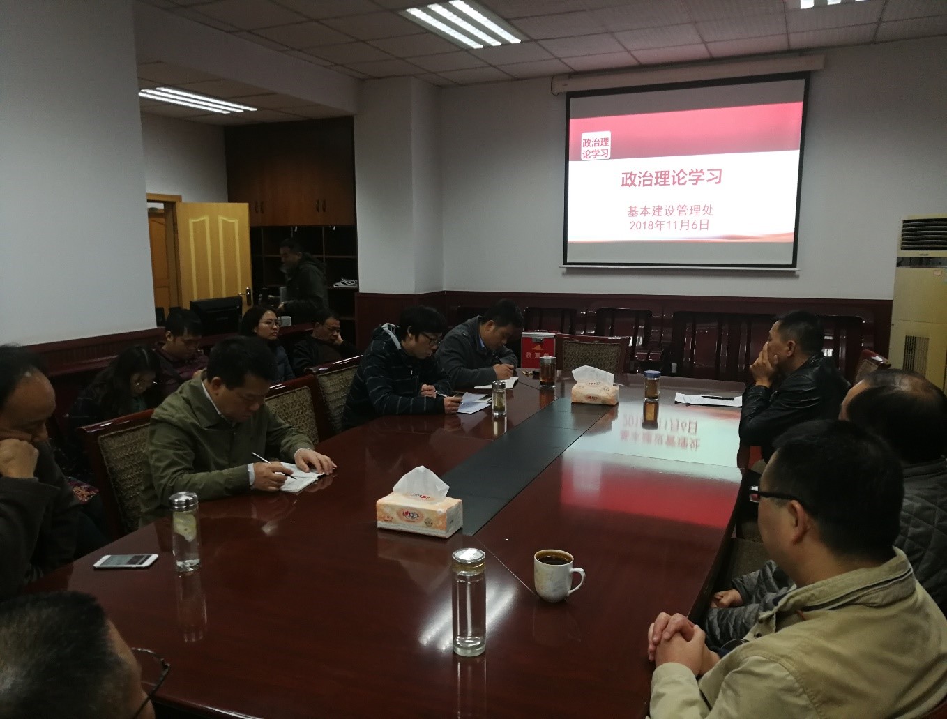 2018年11月6日下午,基本建设管理处全体教职工开展了本年度第八次政治理论学习会。按照学校党委宣传部下发的学习资料要求,学习了《教育部关于加快建设高水平本科教育全面提高人才培养能力的意见》和《教育部关于实施卓越教师培养计划2.0的意见》;传达了学校召开2018年本科教育工作会的精神;中共PA视讯官网委员会印发《关于在干部师生中开展爱校荣校主题教育活动的实施方案》的通知。学习会由吴新宇副处长主持。