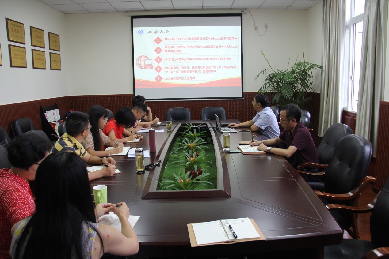 会上,全处教职工集中学习了习近平总书记在全国宣传思想工作会议上的重要讲话精神、习近平总书记在中央全面依法治国委员会第一次会议上的重要讲话精神、习近平总书记给中央美术学院8位老教授的回信精神,以及教育部、财政部、国家发展改革委印发的《关于高等学校加快“双一流”建设的指导意见》,全处职工围绕学习内容,进行了深入而热烈的讨论。