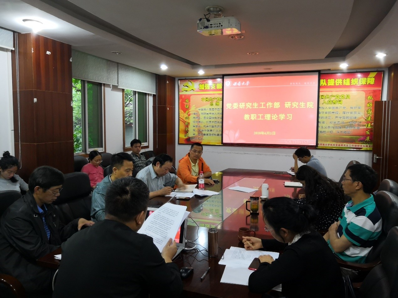 根据党委宣传部要求,2018年6月1日上午,党委研究生工作部研究生院全体教职工开展了本年度第四次政治理论学习,主要学习习近平总书记在中国科学院第十九次院士大会、中国工程院第十四次院士大会上的重要讲话精神;.学习《中共中央 国务院关于全面深化新时代教师队伍建设改革的意见》;学习《教育部关于全面落实研究生导师立德树人职责的意见》。学习由张迪同志主持。