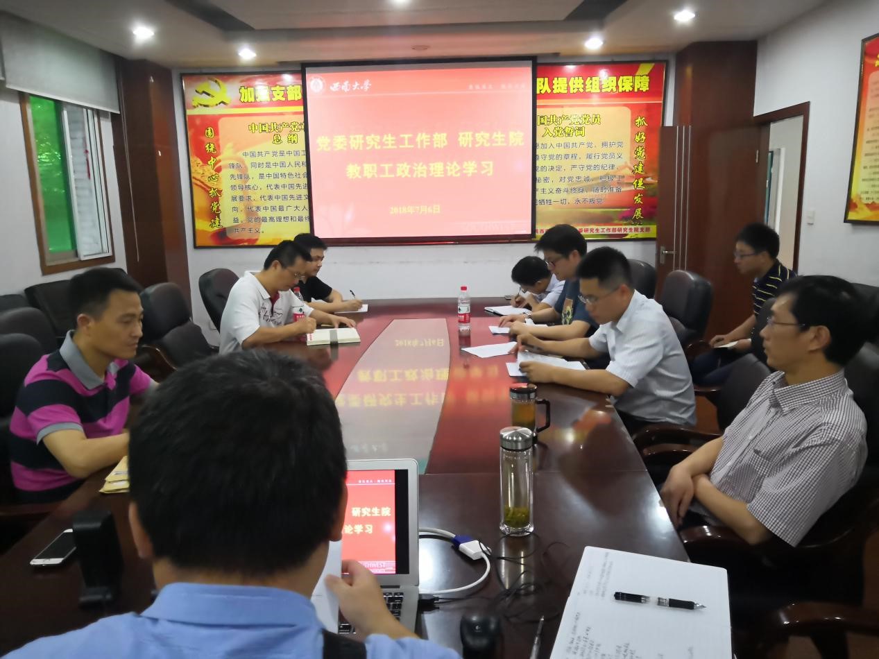 根据党委宣传部要求,2018年7月6日下午,党委研究生工作部研究生院全体教职工开展了本年度第五次政治理论学习,主要学习学习习近平总书记在中共中央政治局第六次集体学习时的重要讲话精神、学习教育部党组书记、部长陈宝生在新时代全国高等学校本科教育工作会议上的讲话精神、学习《教育部关于追授李芳同志“全国优秀教师”荣誉称号的决定》。学习由张迪同志主持。