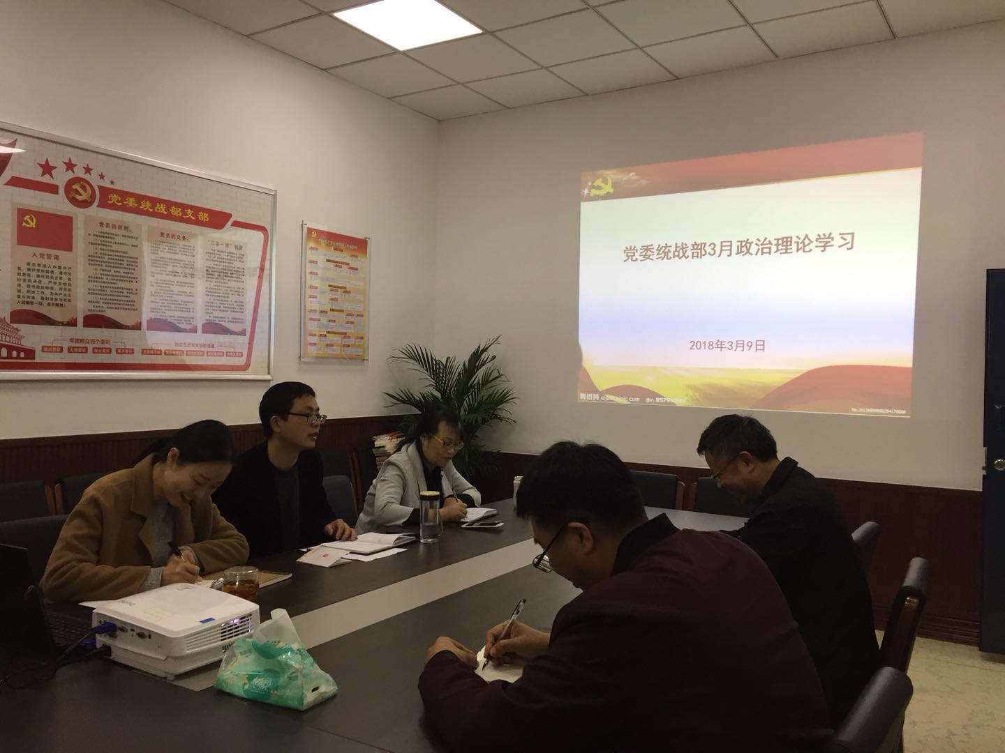 3月9日下午,党委统战部举行政治理论学习,集中学习第十九届二中、三中全会精神,习近平总书记重要讲话精神,2018年全国“两会”精神和新学期干部大会精神。周文全部长主持会议。