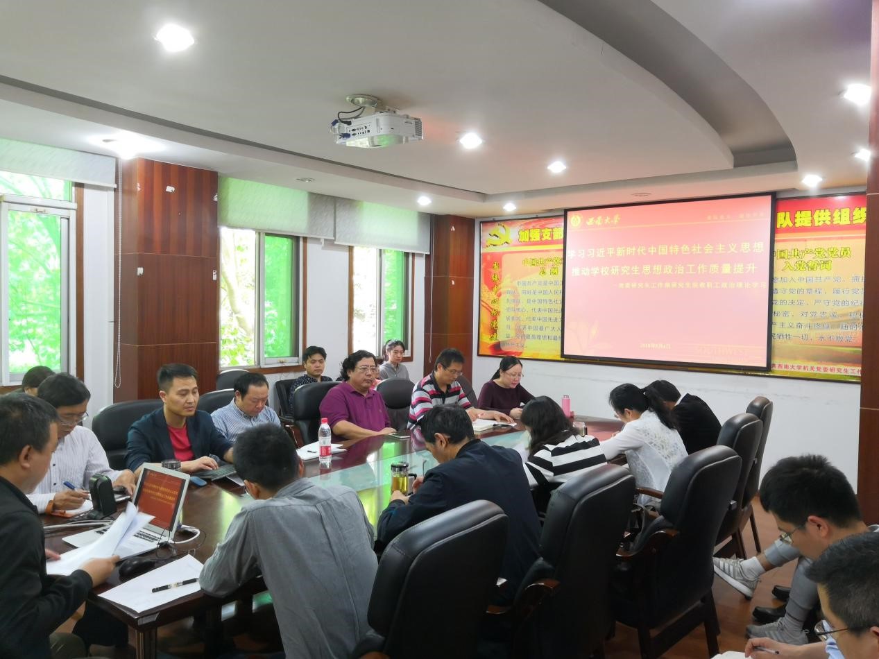 根据学校要求,党委研究生工作部研究生院于2018年5月4日下午2:30,在支部活动室开展了本学期第三次教职工政治理论学习,本次学习的主题是“深入学习习近平新时代中国特色社会主义思想,推动学校研究生思想政治工作质量提升”。会议由胡娟主持。