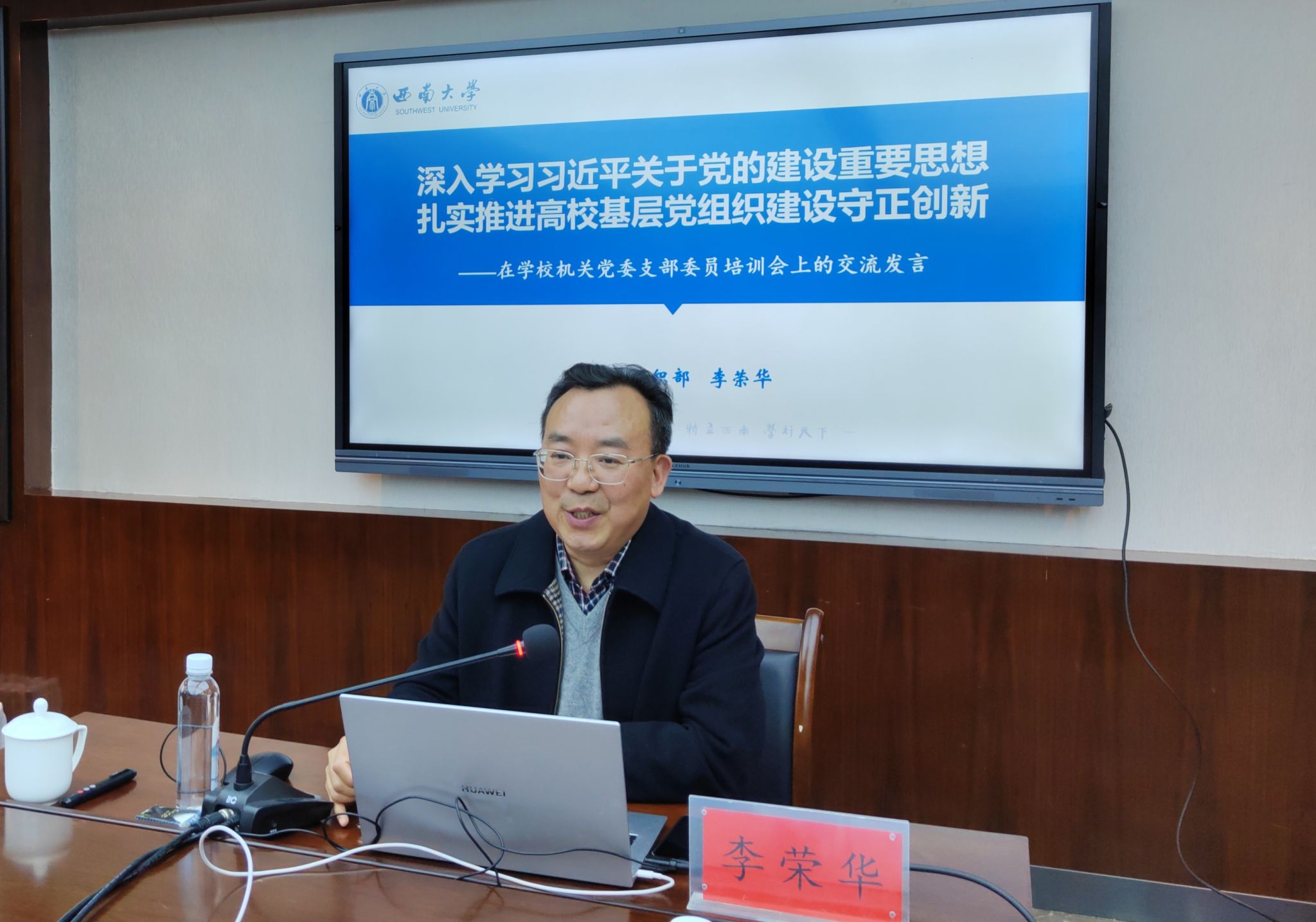 学校党委常委、党委组织部部长李荣华,做《深入学习习近平关于党的建设重要思想 扎实推进高校基层党组织建设守正创新》专题报告,讲述了习近平总书记关于党的建设的重要思想的重大意义和科学体系,系统讲解了《中国共产党普通高等学校基层组织工作条例》,剖析了当前高校基层党组织建设中的几个重点问题。李荣华指出,机关党建工作必须适应新形势新任务的需要,坚持走在前作表率,切实保证高校五大职能的顺利实现。